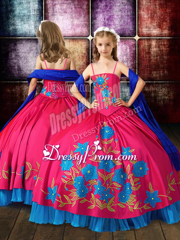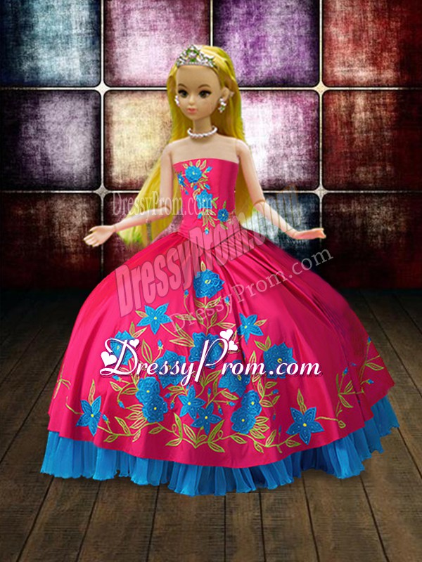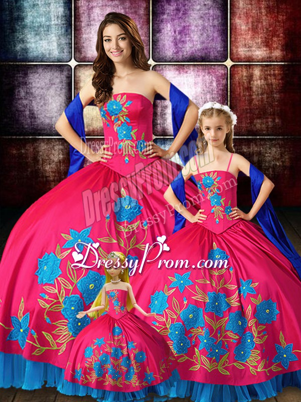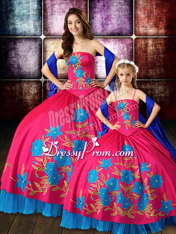 Neckline : StraplessShown Color : Hot PinkSilhouette : Ball GownsSleeve Length : sleevelessHemline : floor lengthBack Detail : Lace upFabric : TaffetaEmbellishment : EmbroideryOccasion : Military Ball,Sweet 16,QuinceaneraSeason : Spring,Summer,Fall,Winter