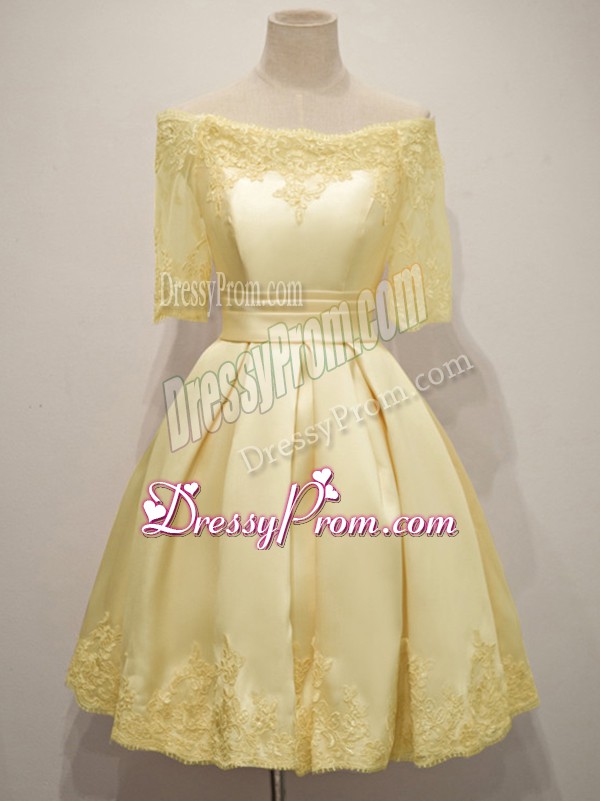 Neckline : Off the shoulderShown Color : YellowSilhouette : A-lineSleeve Length : half sleevesHemline : knee lengthBack Detail : Lace upFabric : TaffetaEmbellishment : LaceOccasion : Prom,Party,Wedding PartySeason : Spring,Summer,Fall