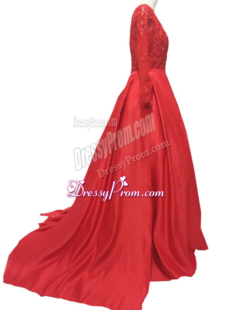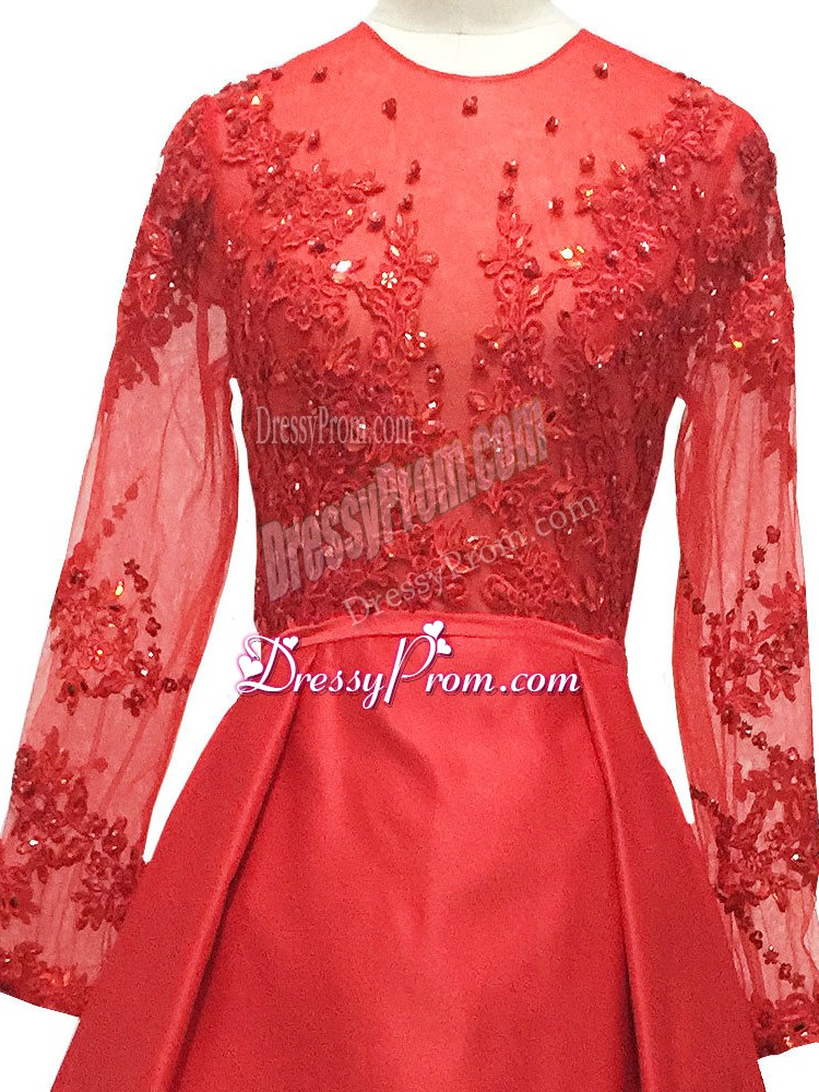 Neckline : High-neckShown Color : RedSilhouette : A-lineSleeve Length : long sleevesBack Detail : ZipperFabric : Elastic Woven SatinEmbellishment : Lace,AppliquesOccasion : Prom,Party,Military Ball,Sweet 16Season : Spring,Summer,Fall,Winter