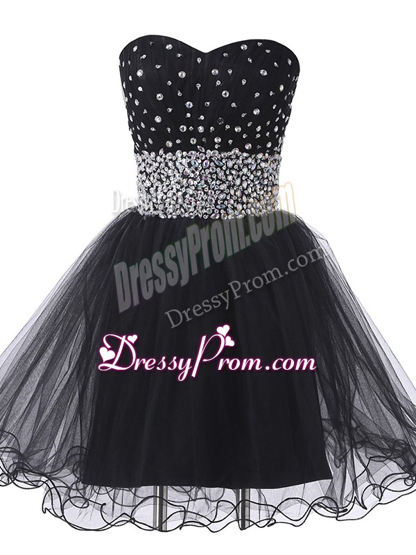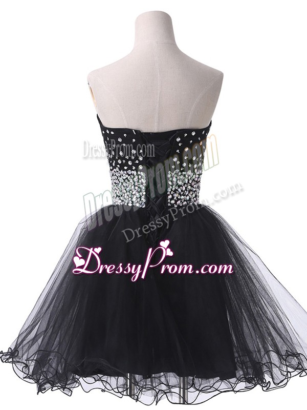 Neckline : SweetheartShown Color : BlackSilhouette : A-lineSleeve Length : sleevelessHemline : mini lengthBack Detail : Lace upFabric : TulleEmbellishment : BeadingOccasion : Prom,Party,Sweet 16Season : Spring,Summer,Fall