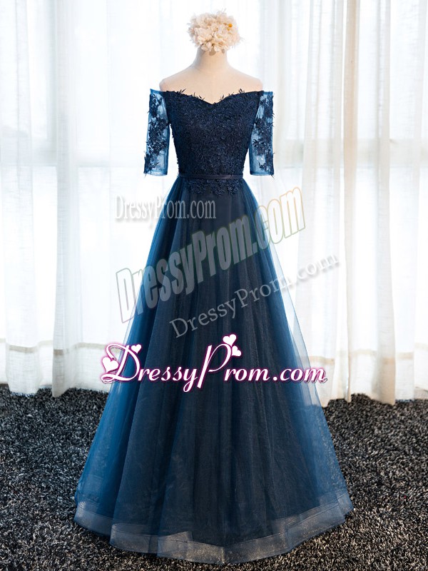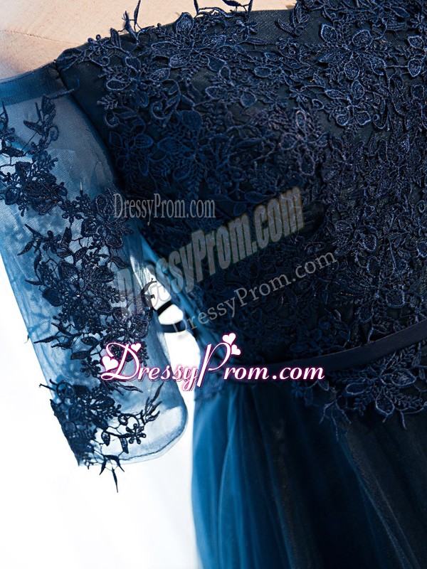 Neckline : V-neckShown Color : Navy BlueSilhouette : A-lineSleeve Length : half sleevesHemline : floor lengthBack Detail : Lace upFabric : TulleEmbellishment : Beading,Lace,AppliquesOccasion : Prom,Party,Sweet 16Season : Spring,Summer,Fall
