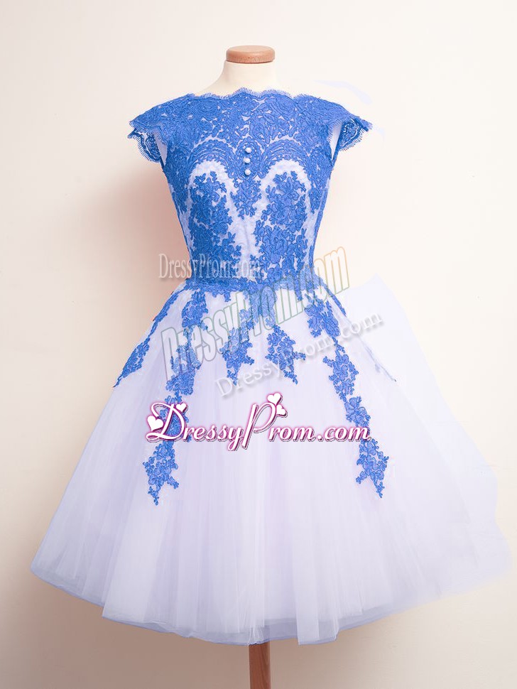 Neckline : Scalloped Shown Color : Blue And White Silhouette : A-line Sleeve Length : sleeveless Hemline : knee length Back Detail : Lace up Fabric : Tulle Embellishment : Appliques Occasion : Prom,Party,Wedding Party Season : Spring,Summer,Fall