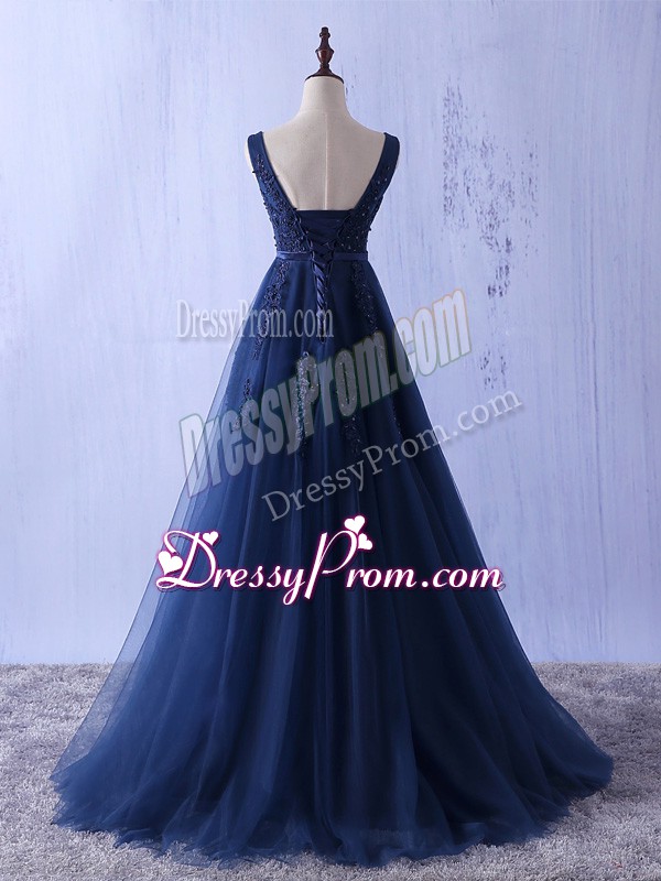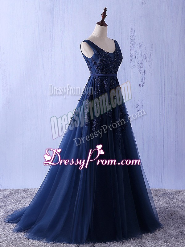 Neckline : StrapsShown Color : Navy BlueSilhouette : A-lineSleeve Length : sleevelessHemline : floor lengthBack Detail : Lace upFabric : TulleEmbellishment : AppliquesOccasion : Prom,PartySeason : Spring,Summer,Fall,Winter