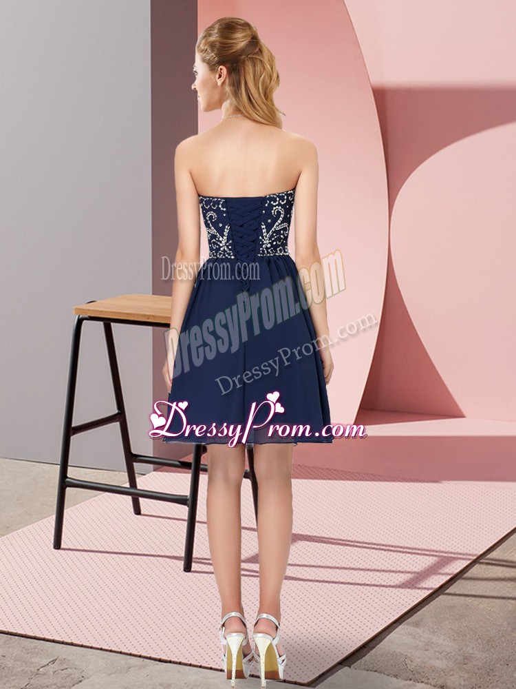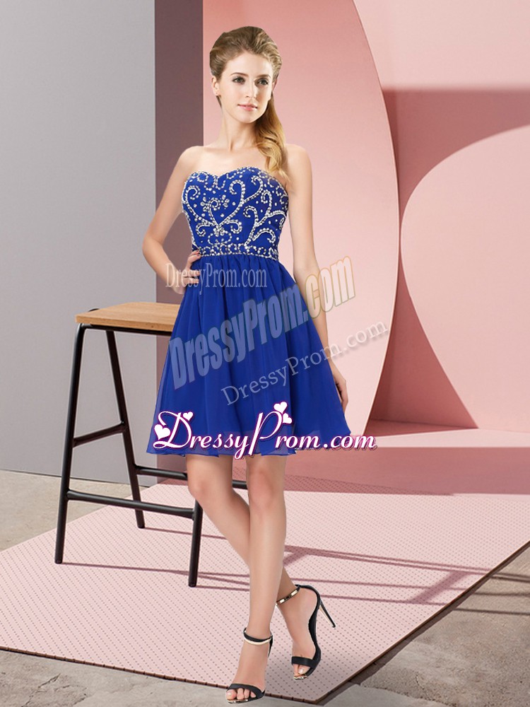 Neckline : SweetheartShown Color : Royal BlueSilhouette : EmpireSleeve Length : sleevelessHemline : mini lengthBack Detail : Lace upFabric : ChiffonEmbellishment : BeadingOccasion : Prom,Party,Sweet 16Season : Spring,Summer,Fall