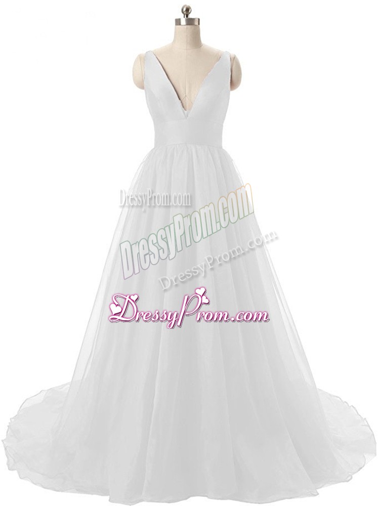 Neckline : V-neckShown Color : WhiteSilhouette : A-lineSleeve Length : sleevelessBack Detail : BacklessFabric : OrganzaEmbellishment : RuchingOccasion : Prom,Party,Military BallSeason : Spring,Summer,Fall,Winter