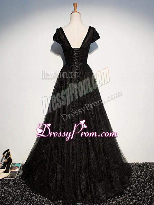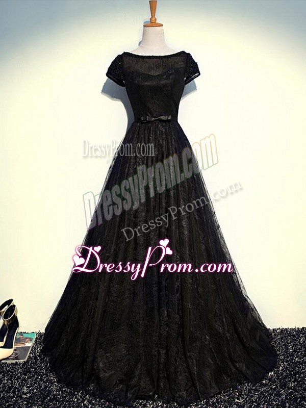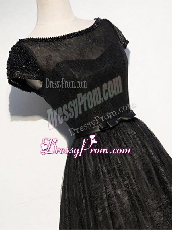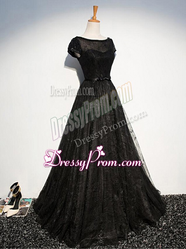 Neckline : ScoopShown Color : BlackSilhouette : EmpireSleeve Length : short sleevesHemline : floor lengthBack Detail : ZipperFabric : TulleEmbellishment : Beading,Lace,BeltOccasion : Prom,Party,Sweet 16,BeachSeason : Spring,Summer,Fall,Winter