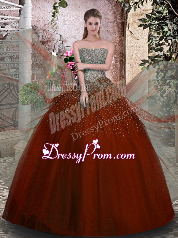 Neckline : StraplessShown Color : Rust RedSilhouette : Ball GownsSleeve Length : sleevelessHemline : floor lengthBack Detail : Lace upFabric : TulleEmbellishment : BeadingOccasion : Military Ball,Sweet 16Season : Spring,Summer,Fall,Winter