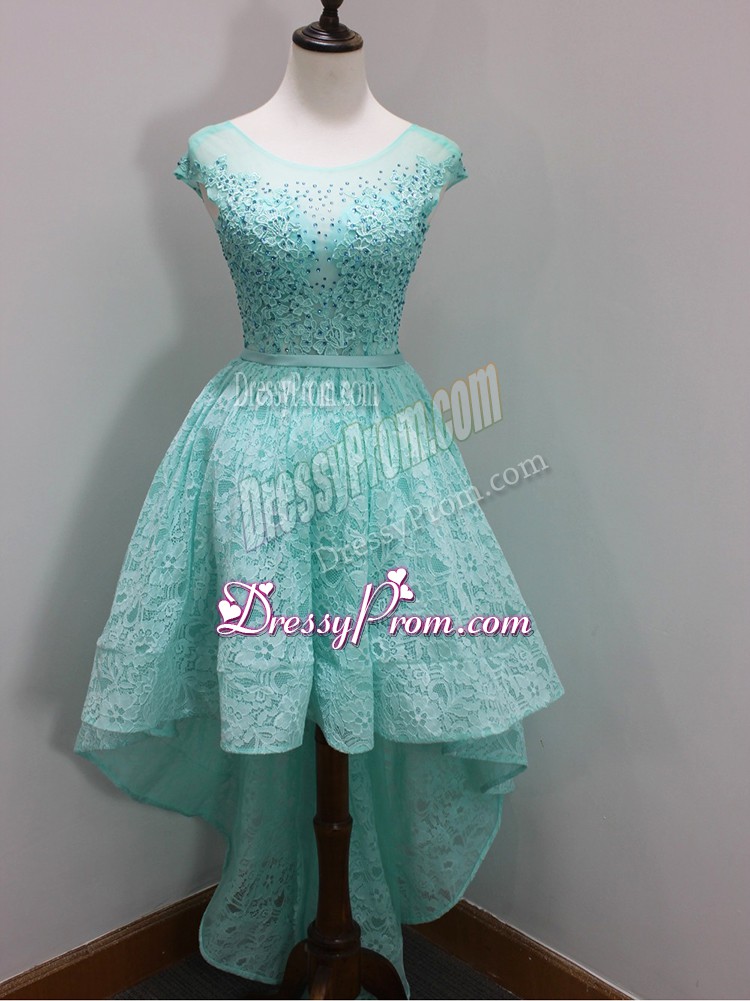 Neckline : Scoop Shown Color : Aqua Blue Silhouette : A-line Sleeve Length : cap sleeves Hemline : high low Back Detail : Zipper Fabric : Lace Embellishment : Beading,Lace Occasion : Prom,Party,Wedding Party Season : Spring,Summer,Fall,Winter