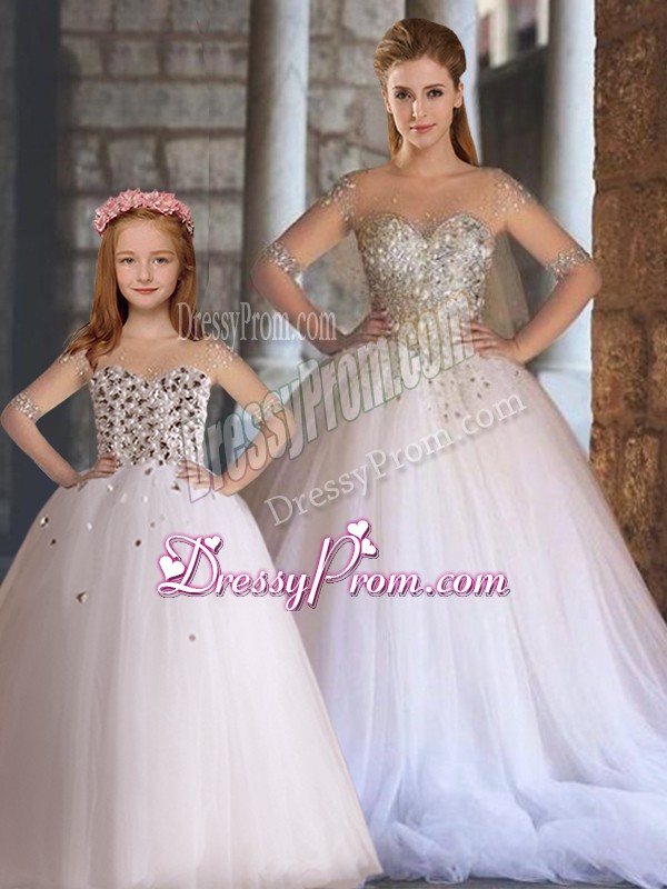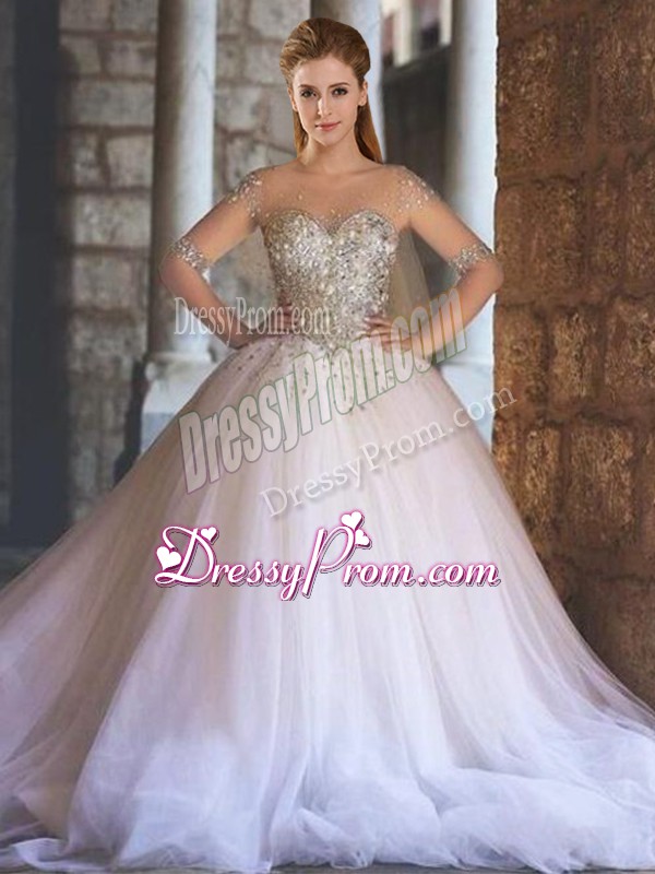 Neckline : ScoopShown Color : WhiteSilhouette : Ball GownsSleeve Length : half sleevesHemline : floor lengthBack Detail : Lace upFabric : TulleEmbellishment : BeadingOccasion : Wedding PartySeason : Spring,Summer,Fall,Winter