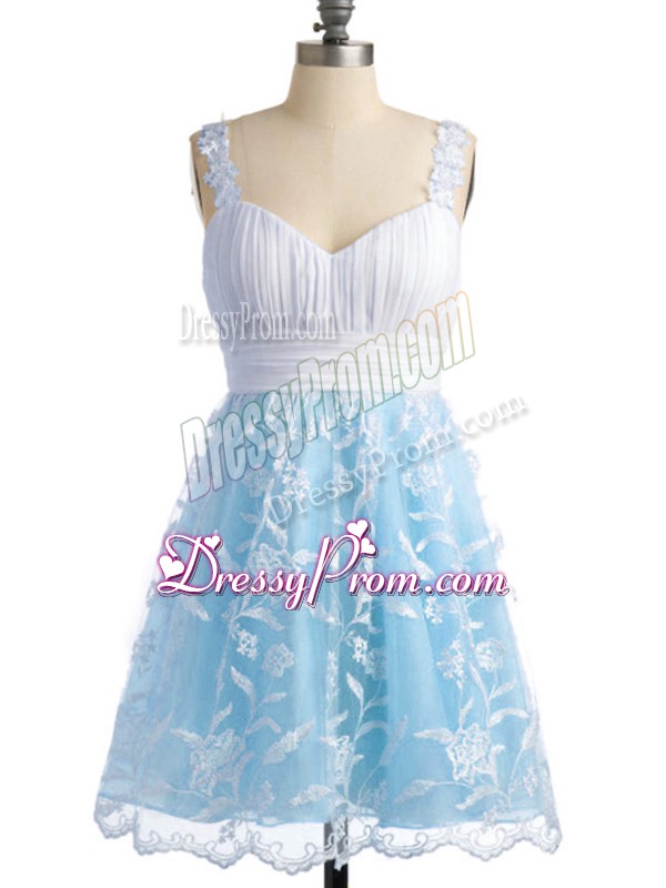 Neckline : StrapsShown Color : Light BlueSilhouette : EmpireSleeve Length : sleevelessHemline : knee lengthBack Detail : Lace upFabric : LaceEmbellishment : LaceOccasion : Prom,Party,Wedding PartySeason : Spring,Summer,Fall