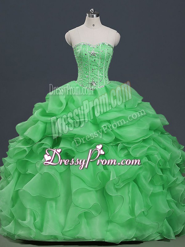 Neckline : SweetheartShown Color : Spring GreenSilhouette : Ball GownsSleeve Length : sleevelessHemline : floor lengthBack Detail : Lace upFabric : OrganzaEmbellishment : Beading,Ruffles,Pick UpsOccasion : Military Ball,Sweet 16,QuinceaneraSeason : Spring,Summer,Fall,Winter