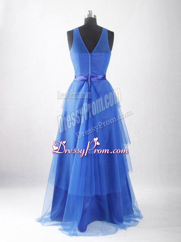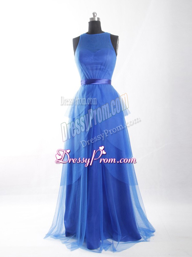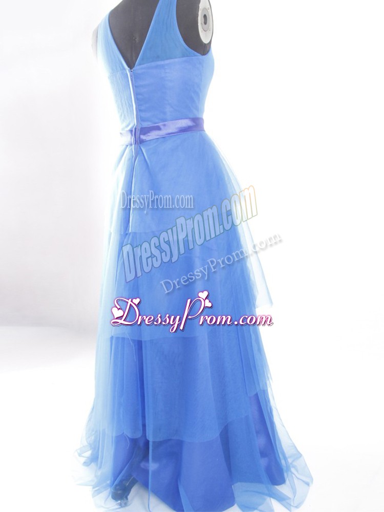Neckline : ScoopShown Color : BlueSilhouette : EmpireSleeve Length : sleevelessHemline : floor lengthBack Detail : ZipperFabric : TulleEmbellishment : Beading,Ruffled Layers,BeltOccasion : Prom,Military BallSeason : Spring,Summer,Fall,Winter
