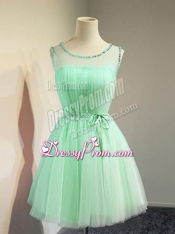 Neckline : ScoopShown Color : Apple GreenSilhouette : EmpireSleeve Length : sleevelessHemline : knee lengthBack Detail : Lace upFabric : TulleEmbellishment : BeltOccasion : Prom,PartySeason : Spring,Summer,Fall