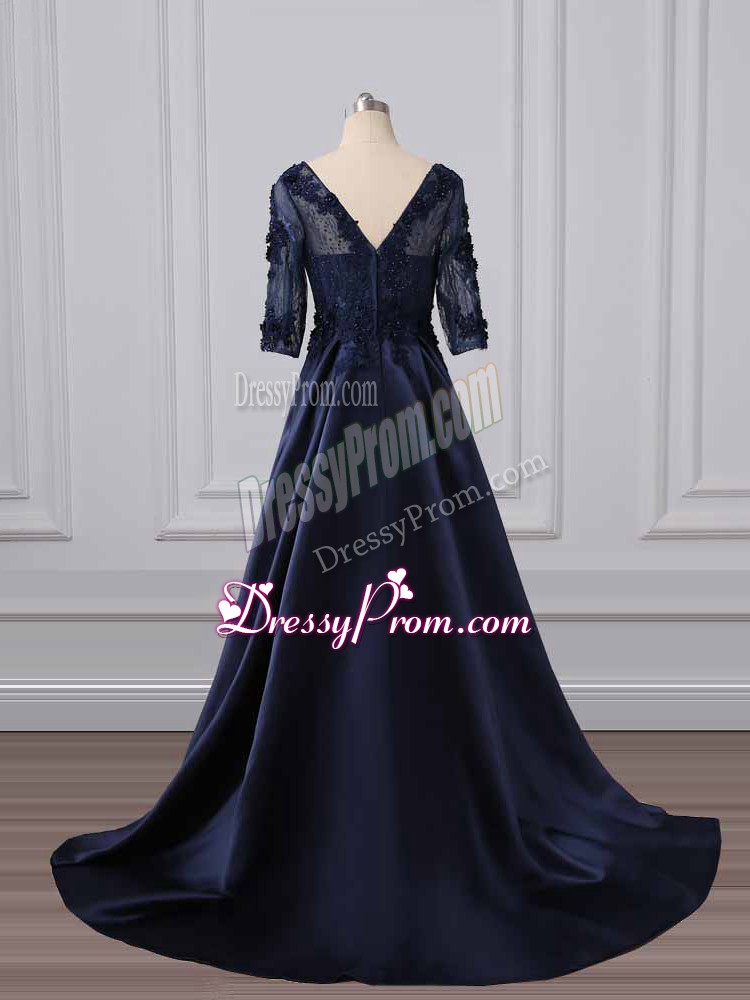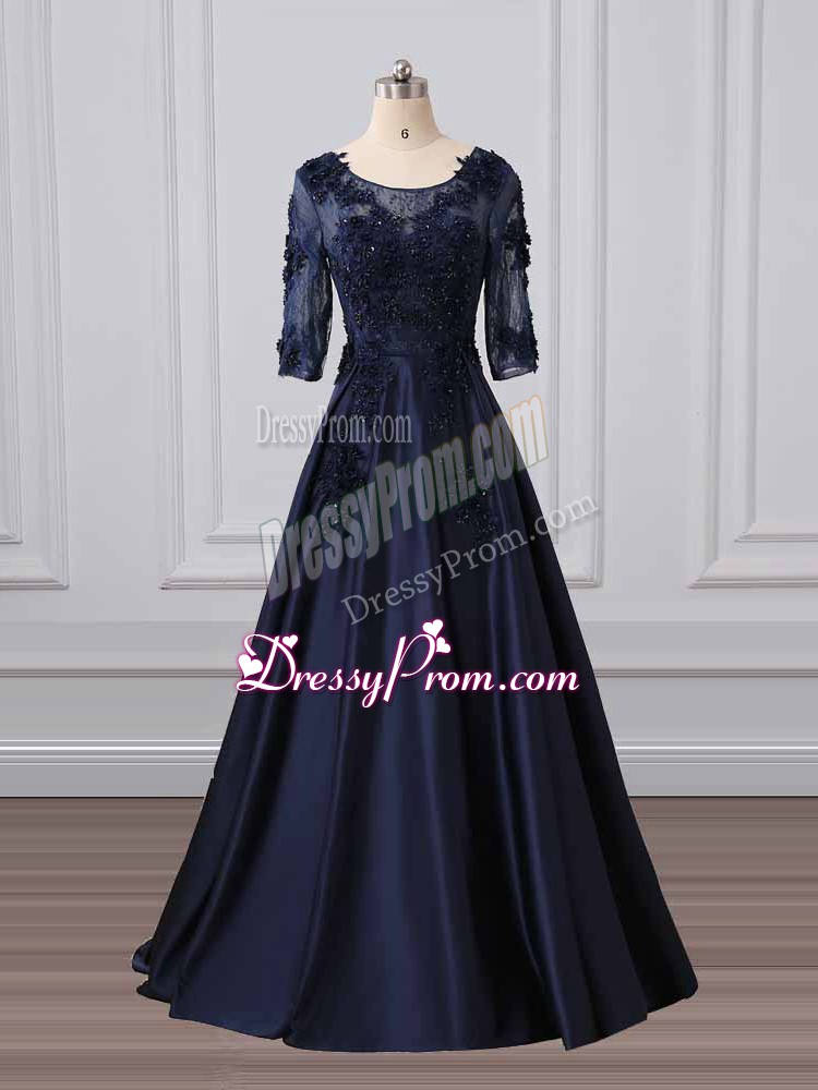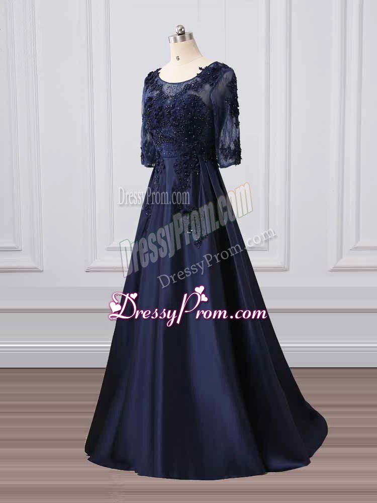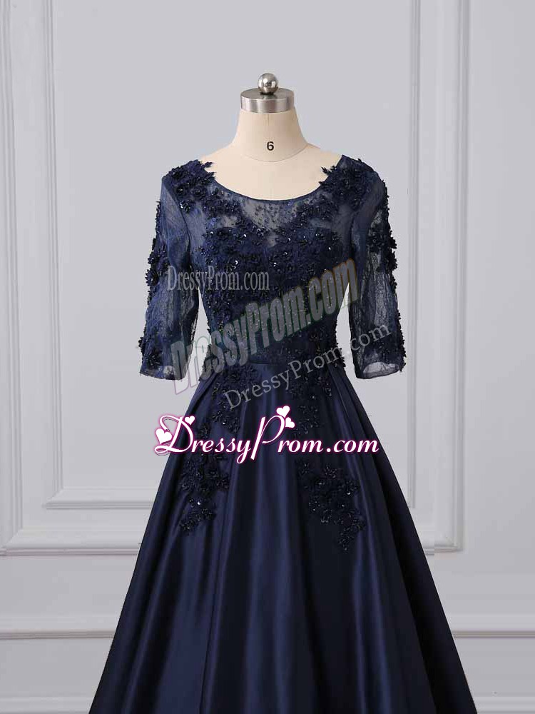 Neckline : ScoopShown Color : Navy BlueSilhouette : A-lineSleeve Length : 3|4 length sleeveBack Detail : ZipperFabric : SatinEmbellishment : Lace,AppliquesOccasion : Party,Sweet 16Season : Spring,Summer,Fall,Winter