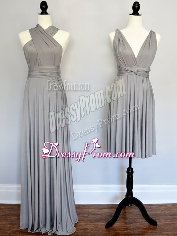 Neckline : Halter topShown Color : GreySilhouette : EmpireSleeve Length : sleevelessHemline : floor lengthBack Detail : Lace upFabric : ChiffonEmbellishment : RuchingOccasion : Prom,Party,Wedding PartySeason : Spring,Summer,Fall,Winter