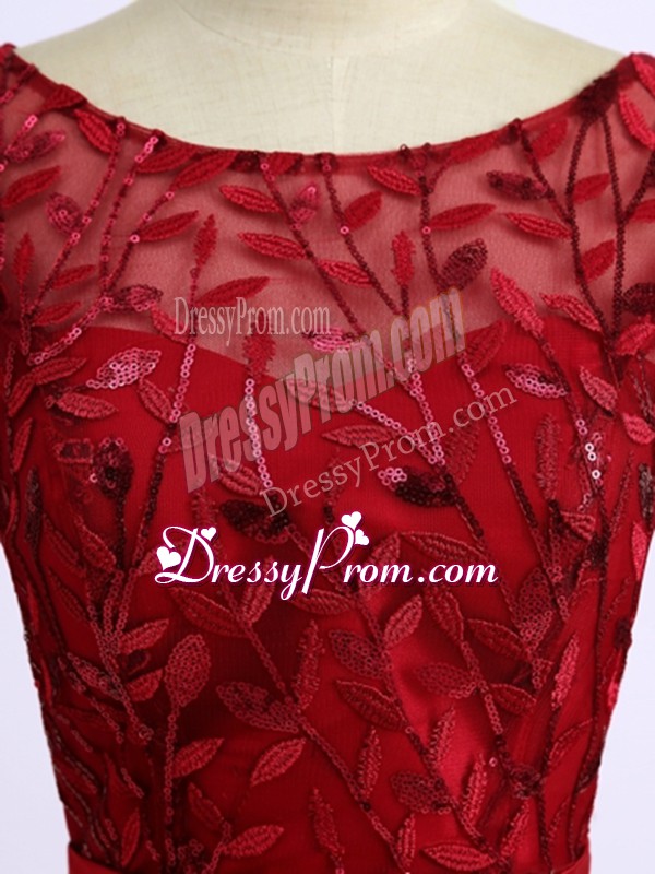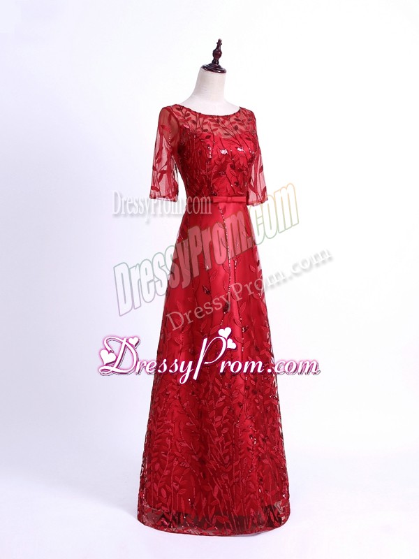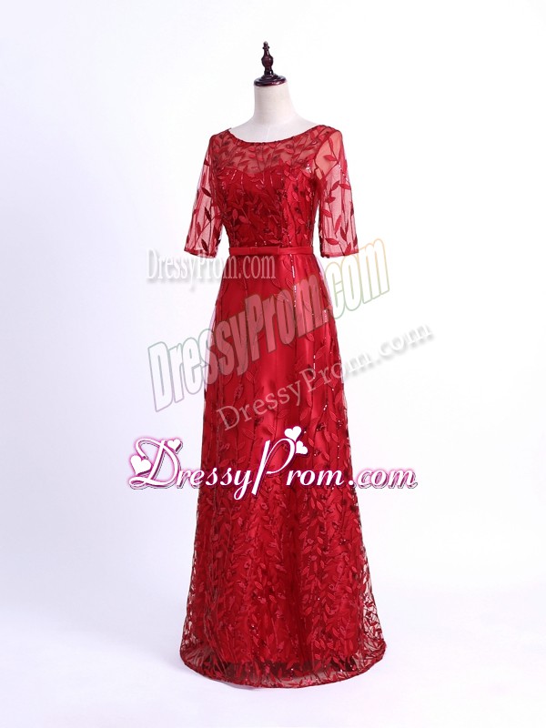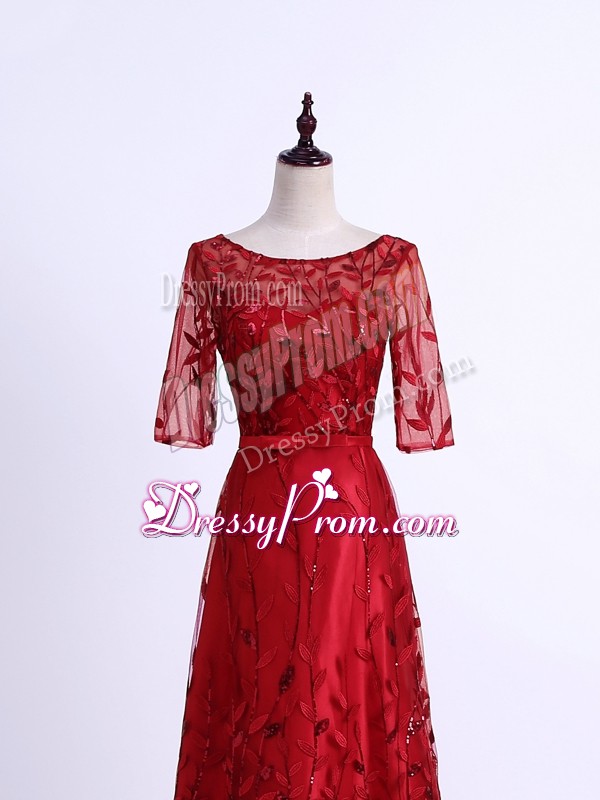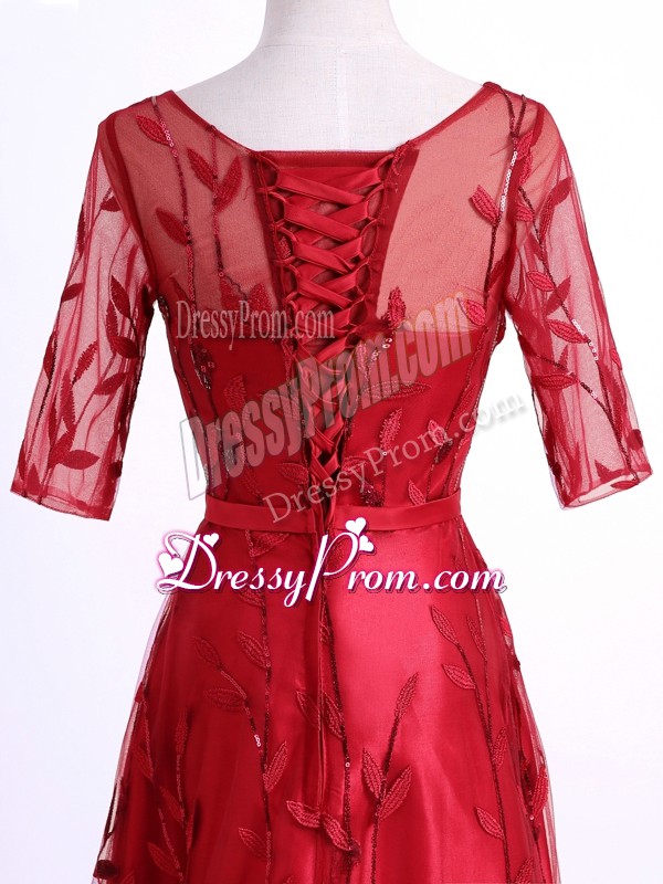 Neckline : ScoopShown Color : RedSilhouette : Column/SheathSleeve Length : half sleevesBack Detail : Lace upFabric : TulleEmbellishment : LaceOccasion : Prom,Party,Military Ball,Sweet 16Season : Spring,Summer,Fall,Winter