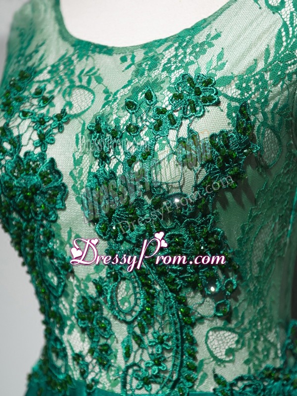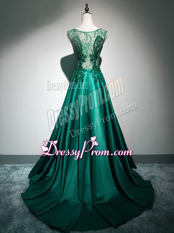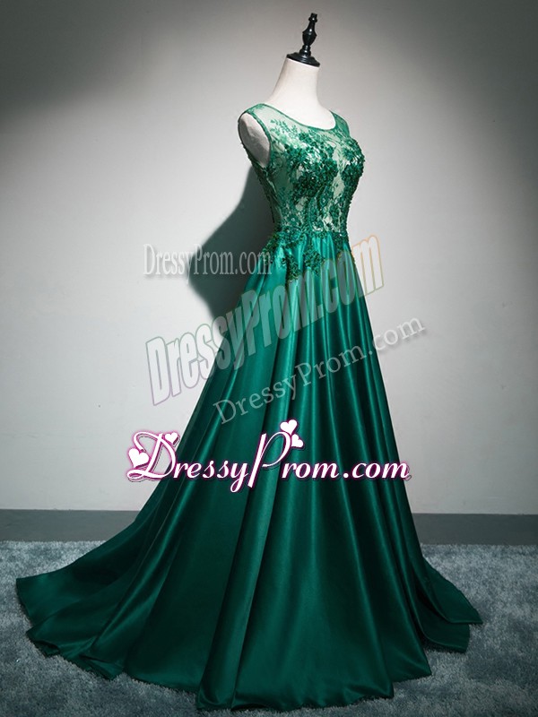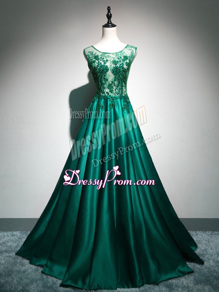 Neckline : ScoopShown Color : Dark GreenSilhouette : A-lineSleeve Length : sleevelessBack Detail : BacklessFabric : Elastic Woven SatinEmbellishment : Beading,Lace,Appliques,EmbroideryOccasion : Prom,PartySeason : Spring,Summer,Fall,Winter