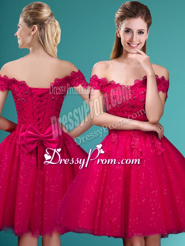 Neckline : Off the shoulder Shown Color : Red Silhouette : A-line Sleeve Length : cap sleeves Hemline : knee length Back Detail : Lace up Fabric : Tulle Embellishment : Lace,Belt Occasion : Prom,Party Season : Spring,Summer,Fall
