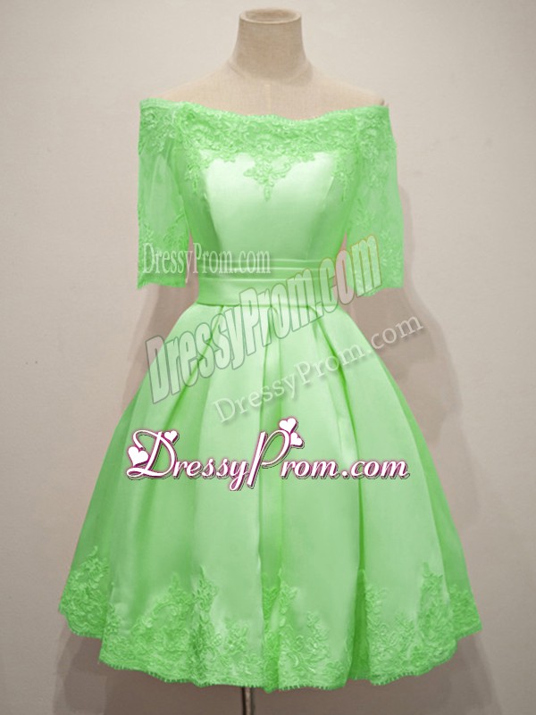 Neckline : Off the shoulder Shown Color : Spring Green Silhouette : A-line Sleeve Length : half sleeves Hemline : knee length Back Detail : Lace up Fabric : Taffeta Embellishment : Lace Occasion : Prom,Party,Wedding Party Season : Spring,Summer,Fall