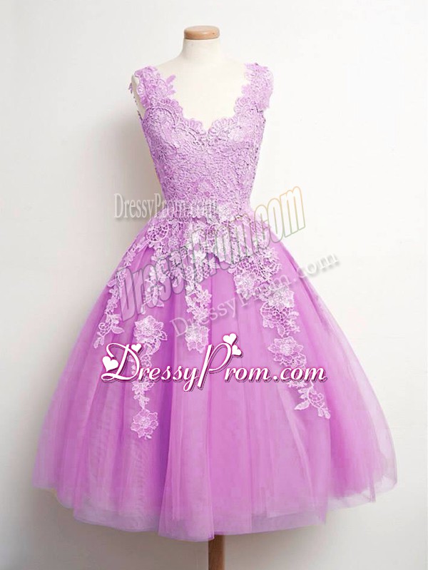Neckline : V-neckShown Color : LilacSilhouette : A-lineSleeve Length : sleevelessHemline : knee lengthBack Detail : Lace upFabric : TulleEmbellishment : LaceOccasion : Prom,Party,Wedding PartySeason : Spring,Summer,Fall