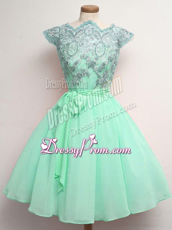 Suitable Apple Green A-line Scalloped Cap Sleeves Chiffon Knee Length Lace Up Lace and Belt Damas Dress