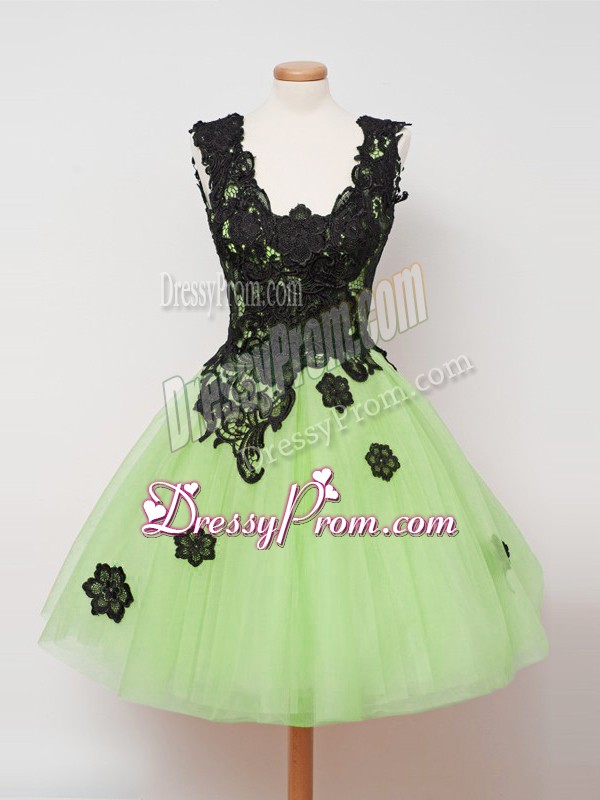 Neckline : StrapsShown Color : Spring GreenSilhouette : Ball GownsSleeve Length : sleevelessHemline : knee lengthBack Detail : ZipperFabric : TulleEmbellishment : AppliquesOccasion : Prom,Party,Wedding PartySeason : Spring,Summer,Fall
