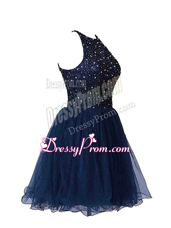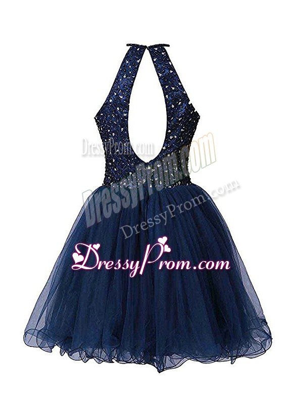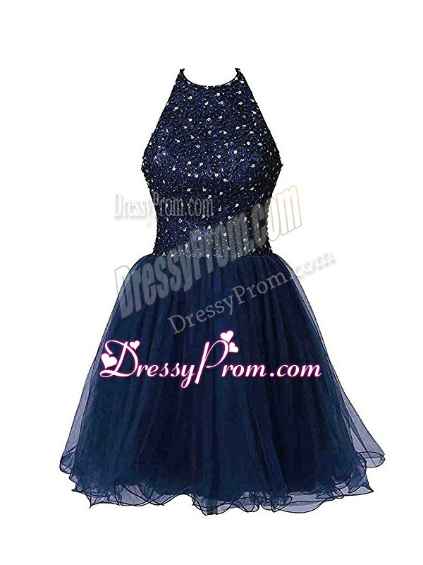 Neckline : Halter topShown Color : Navy BlueSilhouette : A-lineSleeve Length : sleevelessHemline : mini lengthBack Detail : ZipperFabric : TulleEmbellishment : BeadingOccasion : Prom,PartySeason : Spring,Summer,Fall