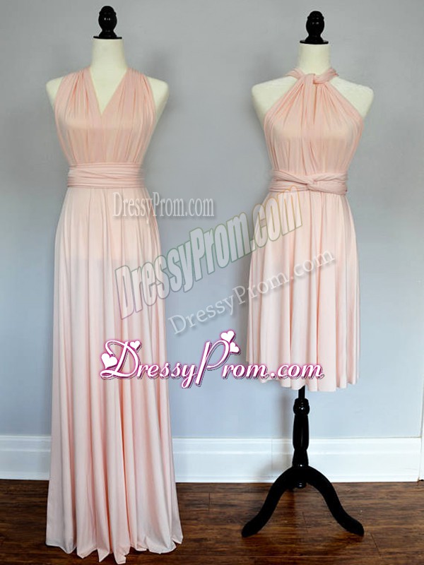 Neckline : Halter topShown Color : Baby Pink,PeachSilhouette : EmpireSleeve Length : sleevelessHemline : floor lengthBack Detail : Lace upFabric : ChiffonEmbellishment : RuchingOccasion : Prom,Wedding PartySeason : Spring,Summer,Fall,Winter