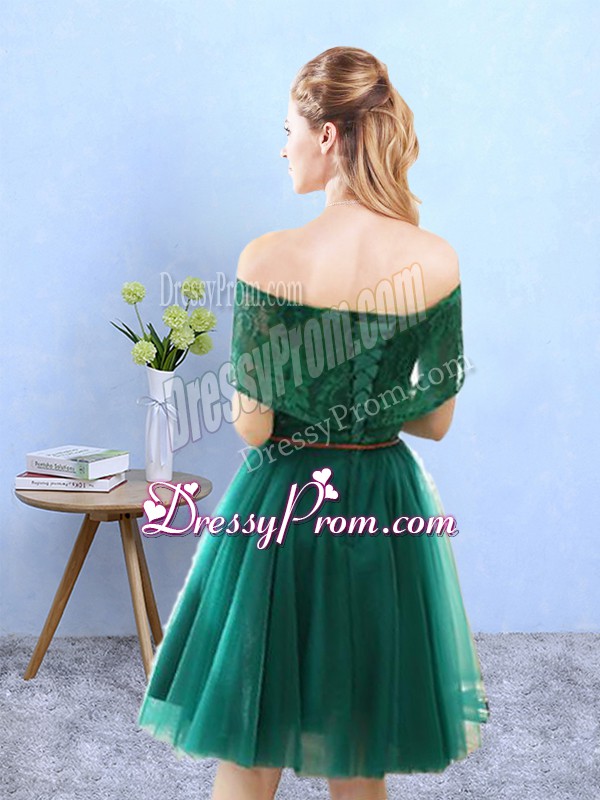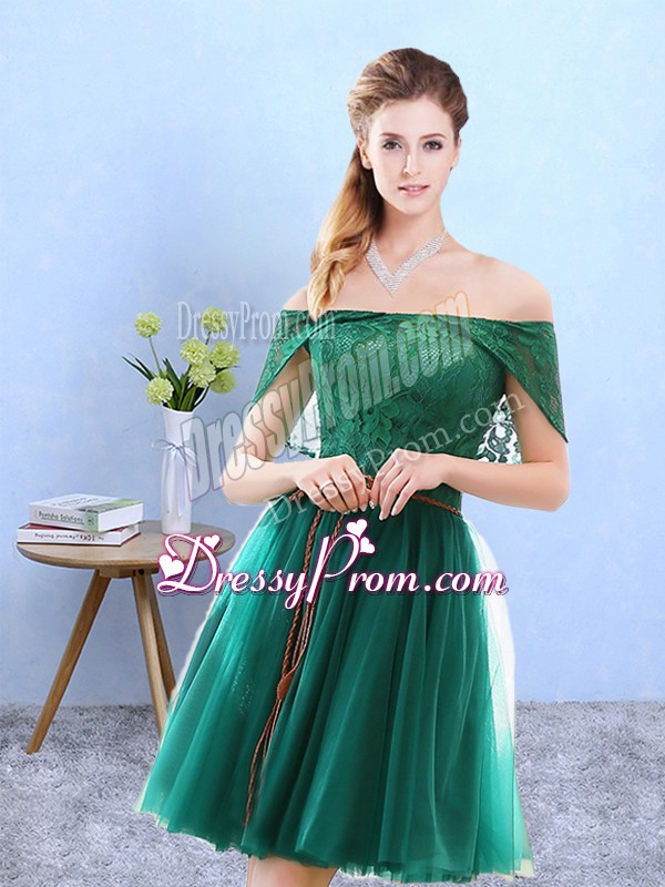Neckline : Off the shoulder Shown Color : Olive Green Silhouette : A-line Sleeve Length : cap sleeves Hemline : knee length Back Detail : Lace up Fabric : Tulle Embellishment : Lace Occasion : Prom,Party Season : Spring,Summer,Fall