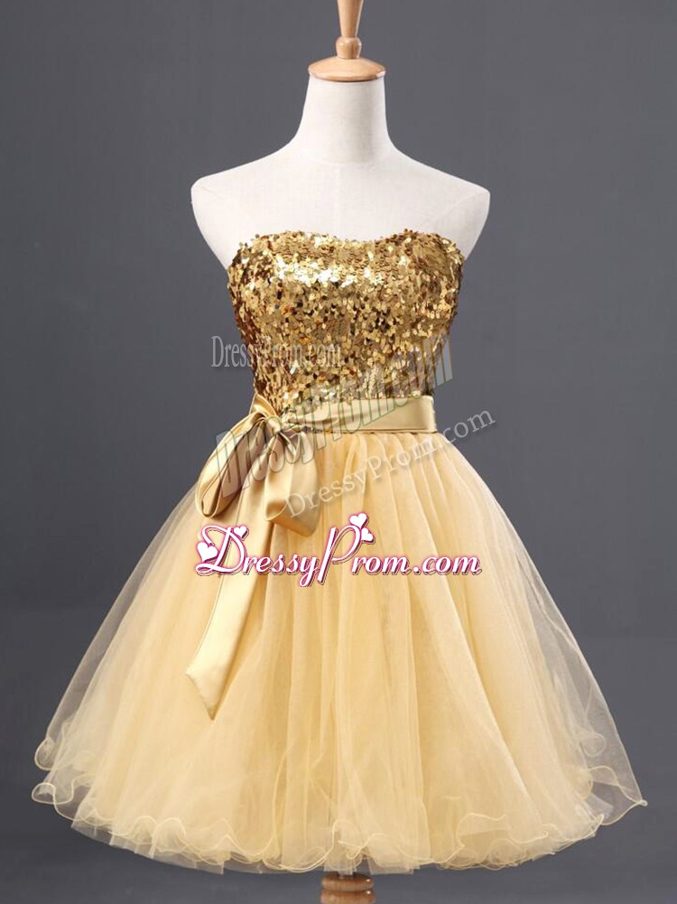 Neckline : SweetheartShown Color : GoldSilhouette : A-lineSleeve Length : sleevelessHemline : mini lengthBack Detail : ZipperFabric : TulleEmbellishment : SequinsOccasion : Prom,PartySeason : Spring,Summer,Fall
