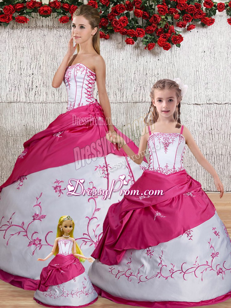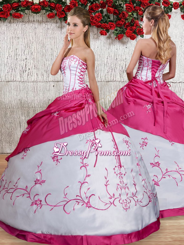 Neckline : StraplessShown Color : WhiteSilhouette : Ball GownsSleeve Length : sleevelessHemline : floor lengthBack Detail : Lace upFabric : TaffetaEmbellishment : Embroidery,Pick UpsOccasion : Military Ball,Sweet 16,QuinceaneraSeason : Spring,Summer,Fall,Winter