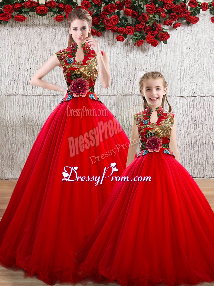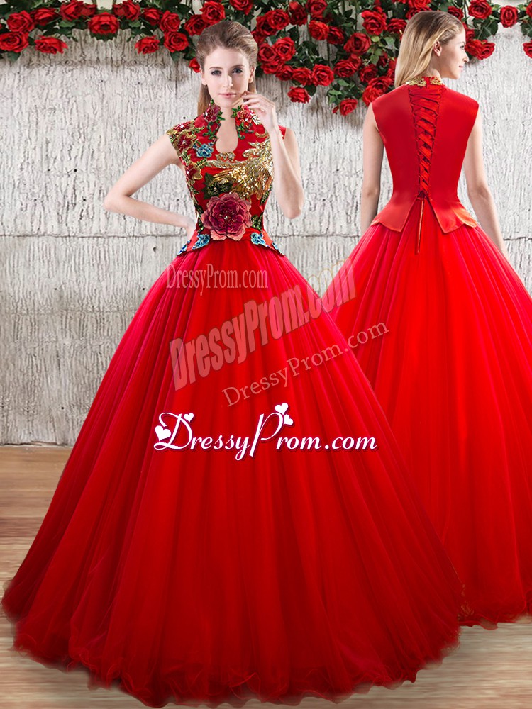 Neckline : High-neckShown Color : RedSilhouette : Ball GownsSleeve Length : sleevelessHemline : floor lengthBack Detail : Lace upFabric : OrganzaEmbellishment : AppliquesOccasion : Military Ball,Sweet 16,QuinceaneraSeason : Spring,Summer,Fall,Winter