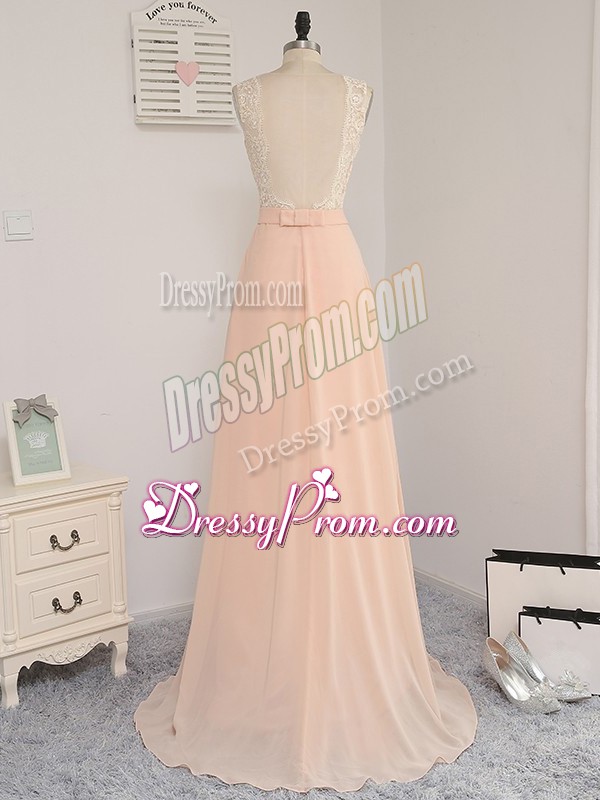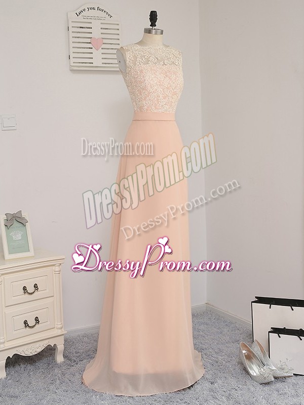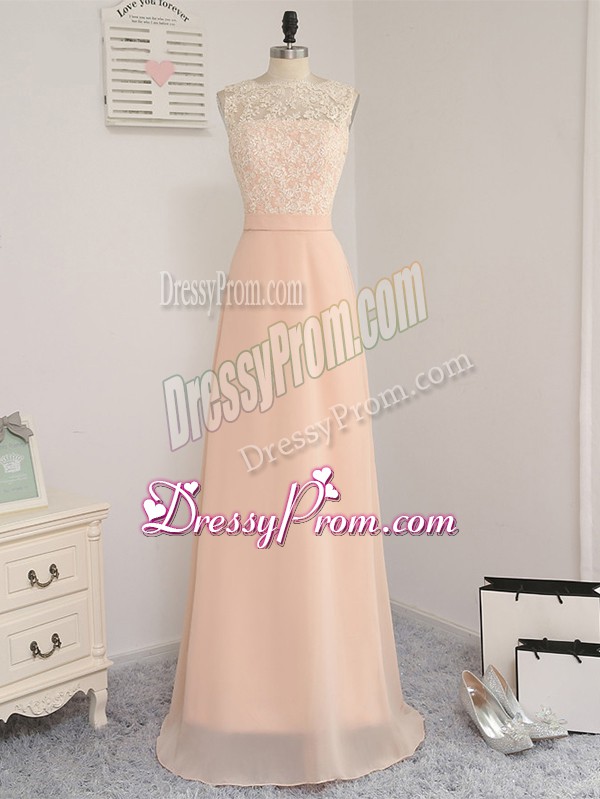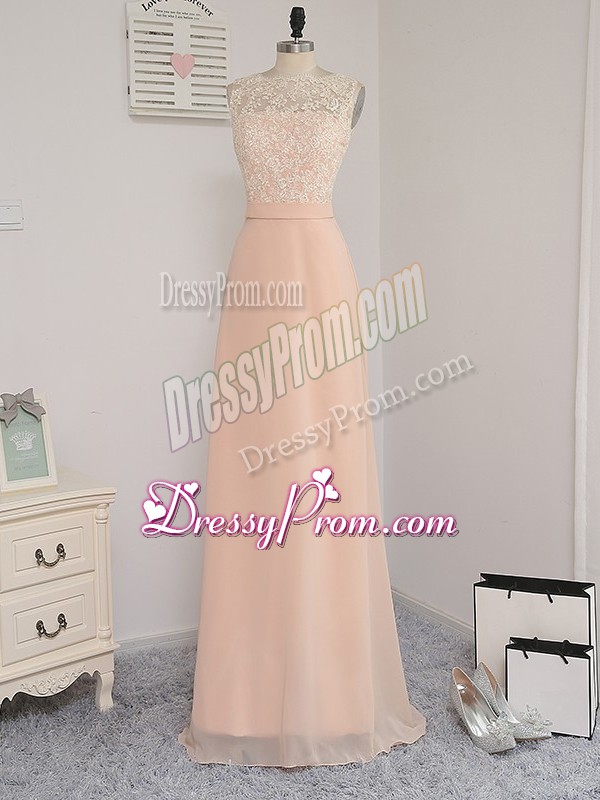 Neckline : BateauShown Color : PeachSilhouette : EmpireSleeve Length : sleevelessHemline : floor lengthBack Detail : BacklessFabric : ChiffonEmbellishment : LaceOccasion : Prom,PartySeason : Spring,Summer,Fall,Winter