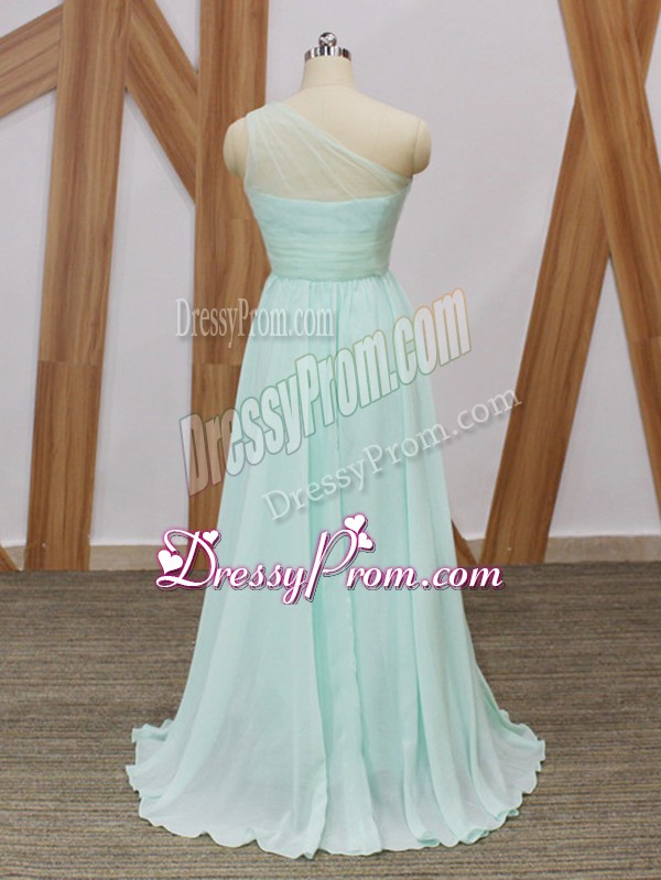 Neckline : One shoulder Shown Color : Apple Green Silhouette : Empire Sleeve Length : sleeveless Back Detail : Side zipper Fabric : Chiffon Embellishment : Ruching Occasion : Prom,Party,Wedding Party Season : Spring,Summer,Fall,Winter