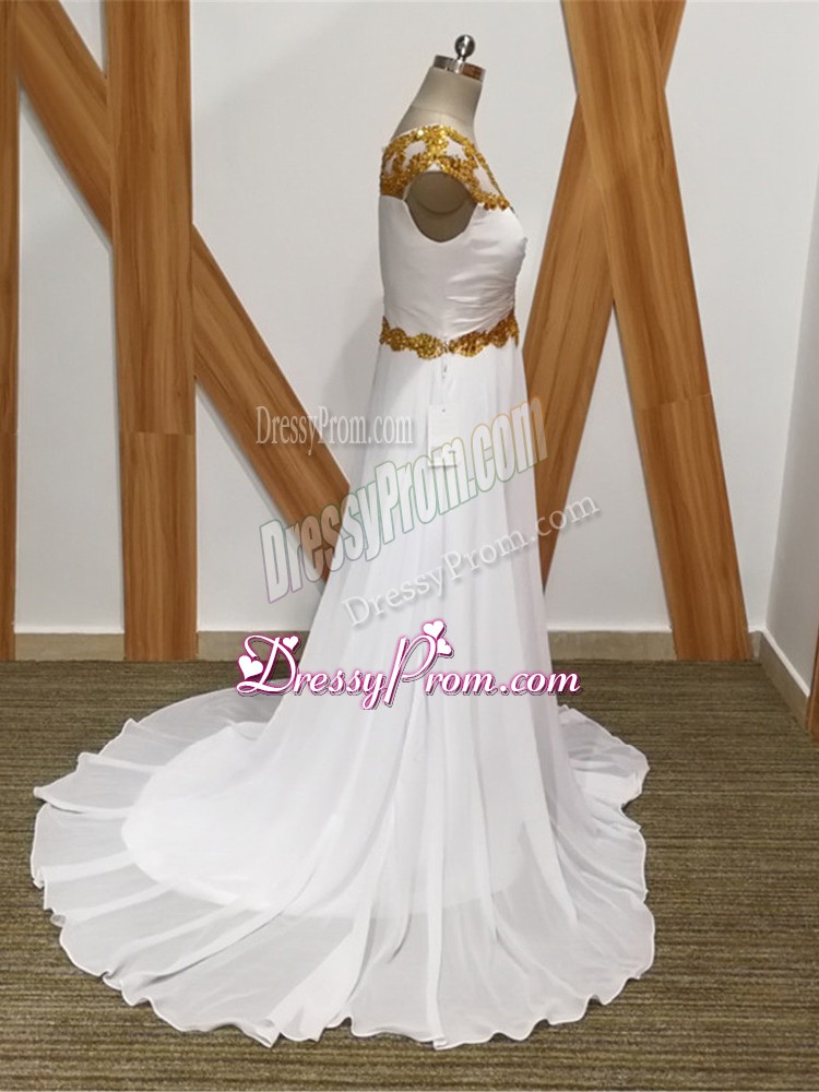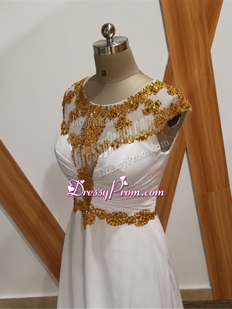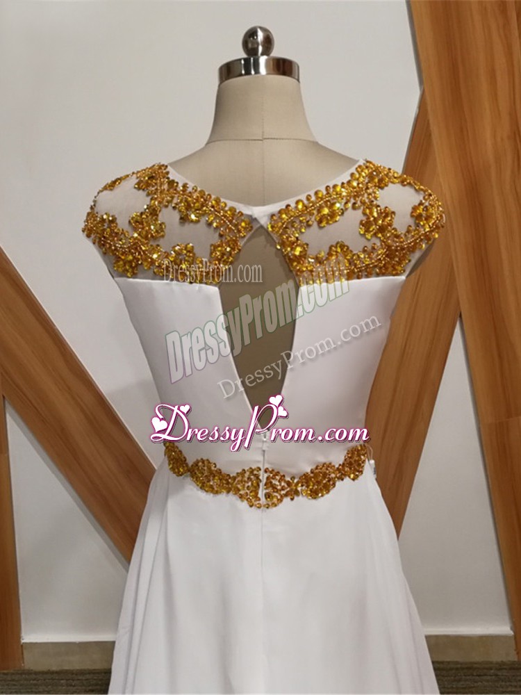 Neckline : ScoopShown Color : WhiteSilhouette : EmpireSleeve Length : sleevelessBack Detail : BacklessFabric : ChiffonEmbellishment : BeadingOccasion : PromSeason : Spring,Summer,Fall,Winter