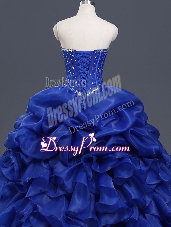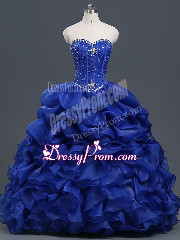 Neckline : SweetheartShown Color : Royal BlueSilhouette : Ball GownsSleeve Length : sleevelessHemline : floor lengthBack Detail : Lace upFabric : OrganzaEmbellishment : Beading,Ruffles,Pick UpsOccasion : Military Ball,Sweet 16,QuinceaneraSeason : Spring,Summer,Fall,Winter