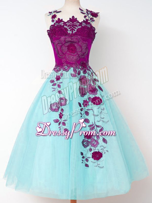 Neckline : StrapsShown Color : Aqua BlueSilhouette : A-lineSleeve Length : sleevelessHemline : knee lengthBack Detail : Lace upFabric : TulleEmbellishment : AppliquesOccasion : Prom,Party,Wedding PartySeason : Spring,Summer,Fall