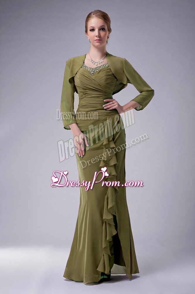Neckline : StrapsShown Color : Olive GreenSilhouette : MermaidSleeve Length : sleevelessHemline : floor lengthBack Detail : ZipperFabric : ChiffonEmbellishment : BeadingOccasion : Prom,PartySeason : Spring,Summer,Fall,Winter