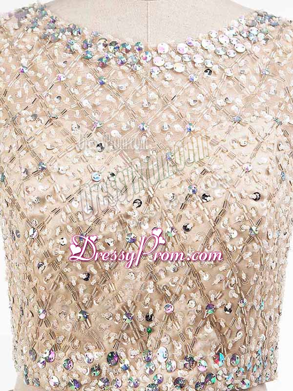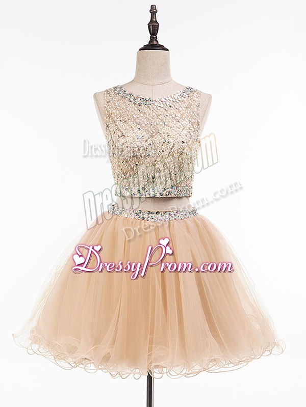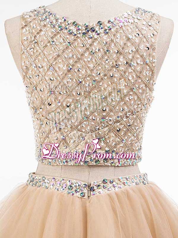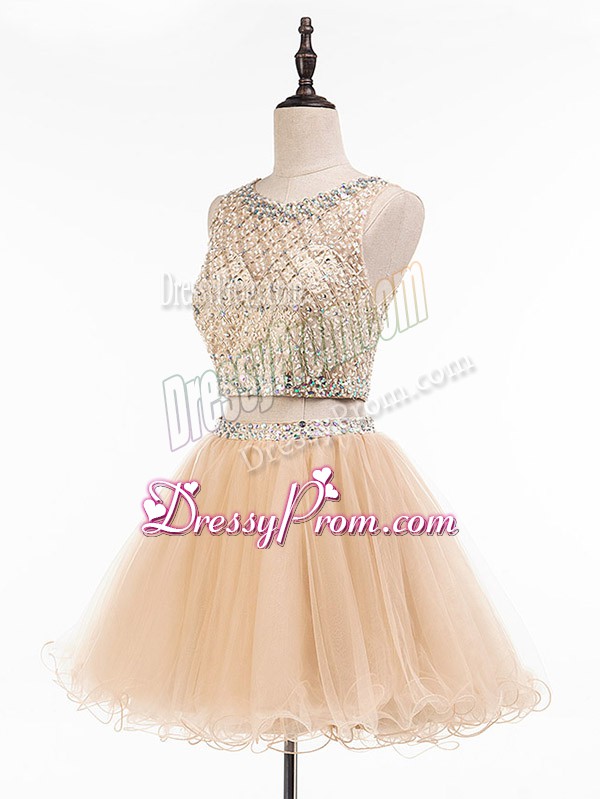 Neckline : ScoopShown Color : ChampagneSilhouette : Two PiecesSleeve Length : sleevelessHemline : mini lengthBack Detail : Side zipperFabric : TulleEmbellishment : BeadingOccasion : Prom,Party,Sweet 16Season : Spring,Summer,Fall