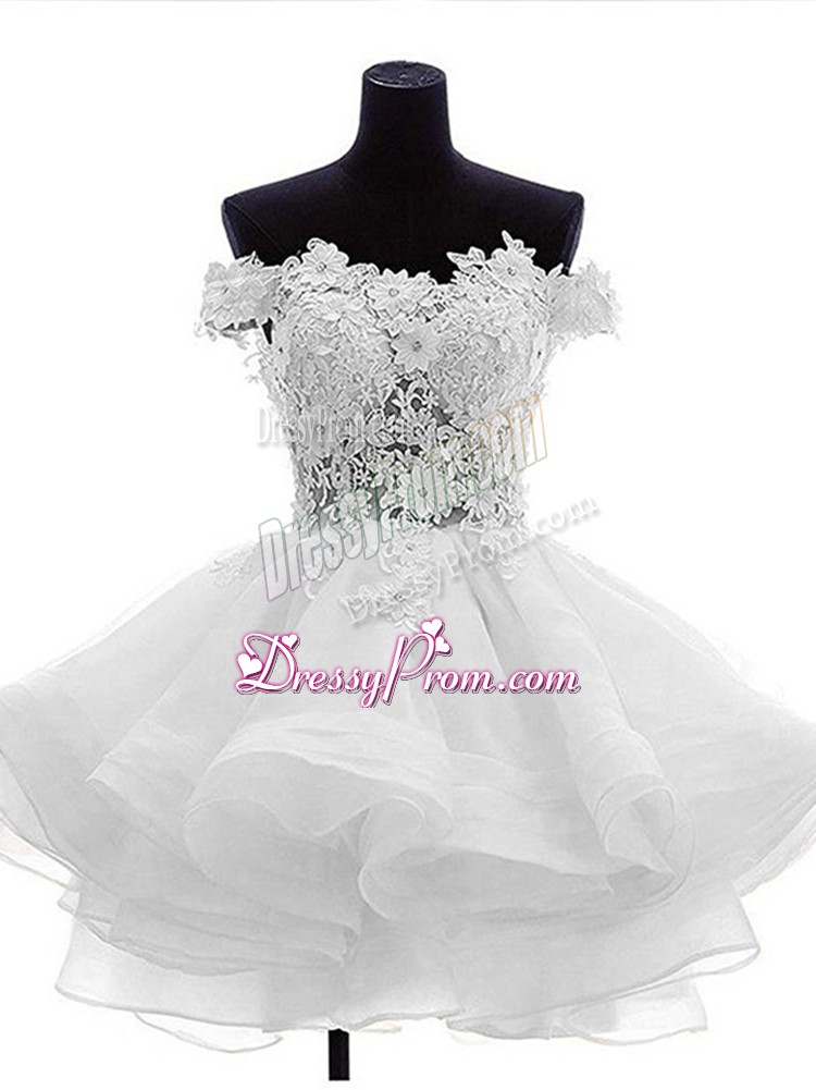 Neckline : Off the shoulderShown Color : WhiteSilhouette : A-lineSleeve Length : sleevelessHemline : mini lengthBack Detail : ZipperFabric : OrganzaEmbellishment : Beading,Lace,RufflesOccasion : Prom,Party,Sweet 16Season : Spring,Summer,Fall