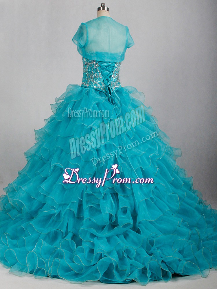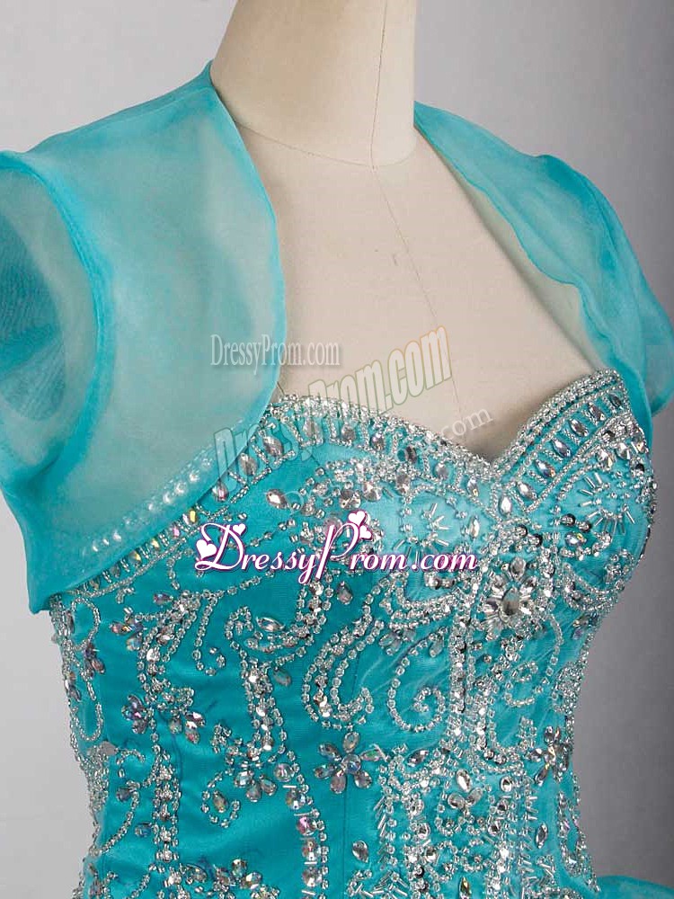 Neckline : SweetheartShown Color : Aqua BlueSilhouette : Ball GownsSleeve Length : sleevelessBack Detail : Lace upFabric : OrganzaEmbellishment : Beading,RufflesOccasion : Sweet 16,QuinceaneraSeason : Spring,Summer,Fall,Winter
