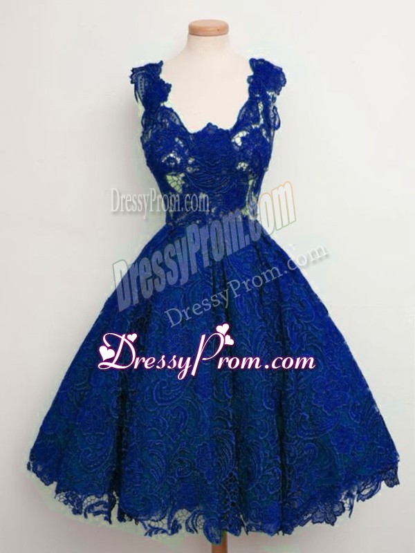 Neckline : StrapsShown Color : Royal BlueSilhouette : A-lineSleeve Length : sleevelessHemline : knee lengthBack Detail : Lace upFabric : LaceEmbellishment : LaceOccasion : Prom,Party,Wedding PartySeason : Spring,Summer,Fall