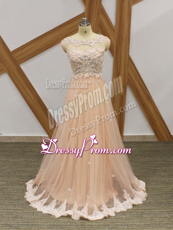 Neckline : ScoopShown Color : ChampagneSilhouette : EmpireSleeve Length : sleevelessHemline : floor lengthBack Detail : ZipperFabric : TulleEmbellishment : Beading,Lace,AppliquesOccasion : Prom,Military Ball,Sweet 16Season : Spring,Summer,Fall,Winter