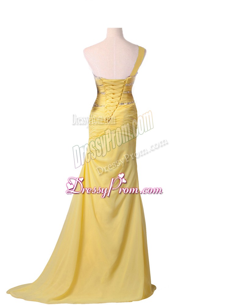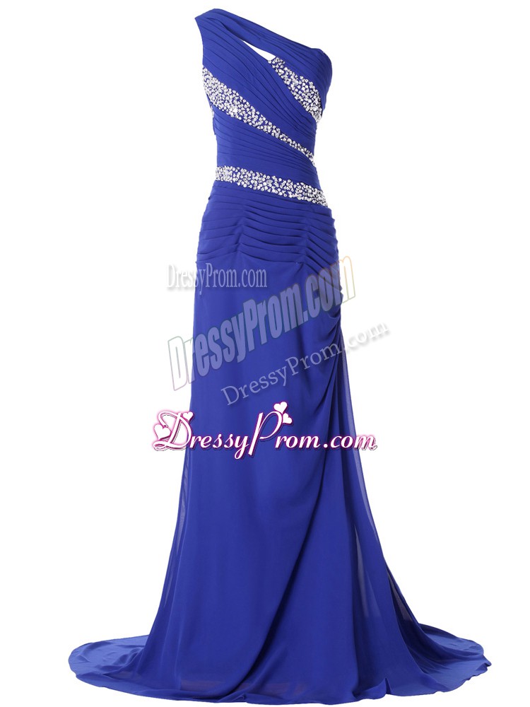 Neckline : One shoulderShown Color : BlueSilhouette : Column/SheathSleeve Length : sleevelessBack Detail : Lace upFabric : ChiffonEmbellishment : Beading,RuchingOccasion : Prom,Party,Military Ball,Sweet 16Season : Spring,Summer,Fall,Winter