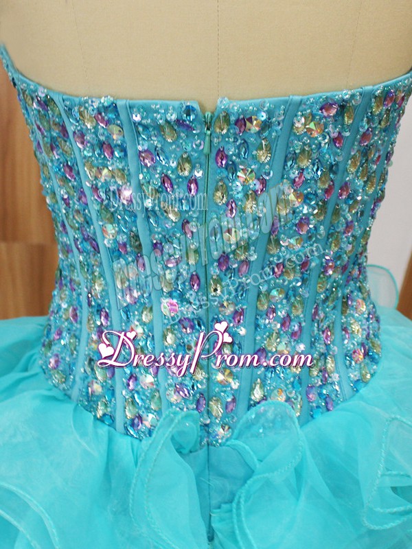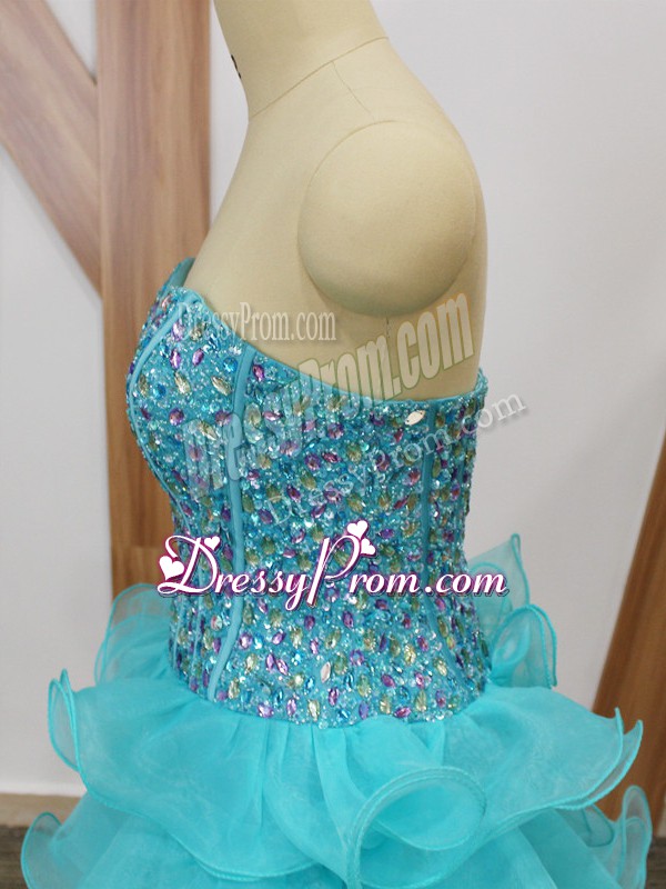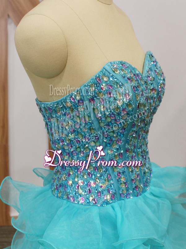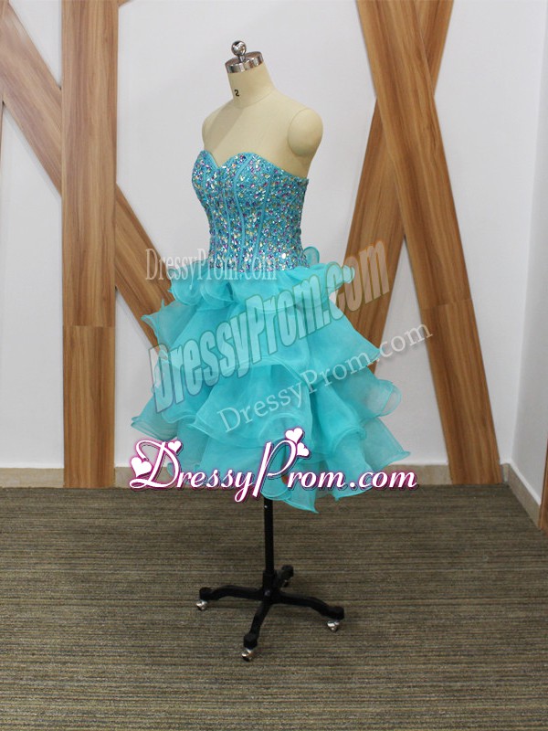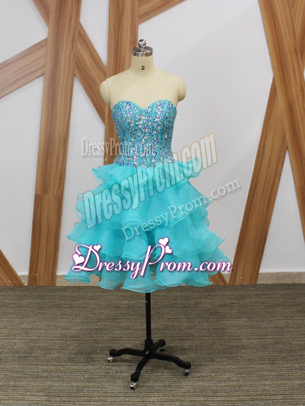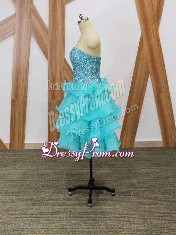 Neckline : SweetheartShown Color : Aqua BlueSilhouette : A-lineSleeve Length : sleevelessHemline : mini lengthBack Detail : ZipperFabric : OrganzaEmbellishment : Beading,Ruffled LayersOccasion : Prom,Party,Sweet 16Season : Spring,Summer,Fall