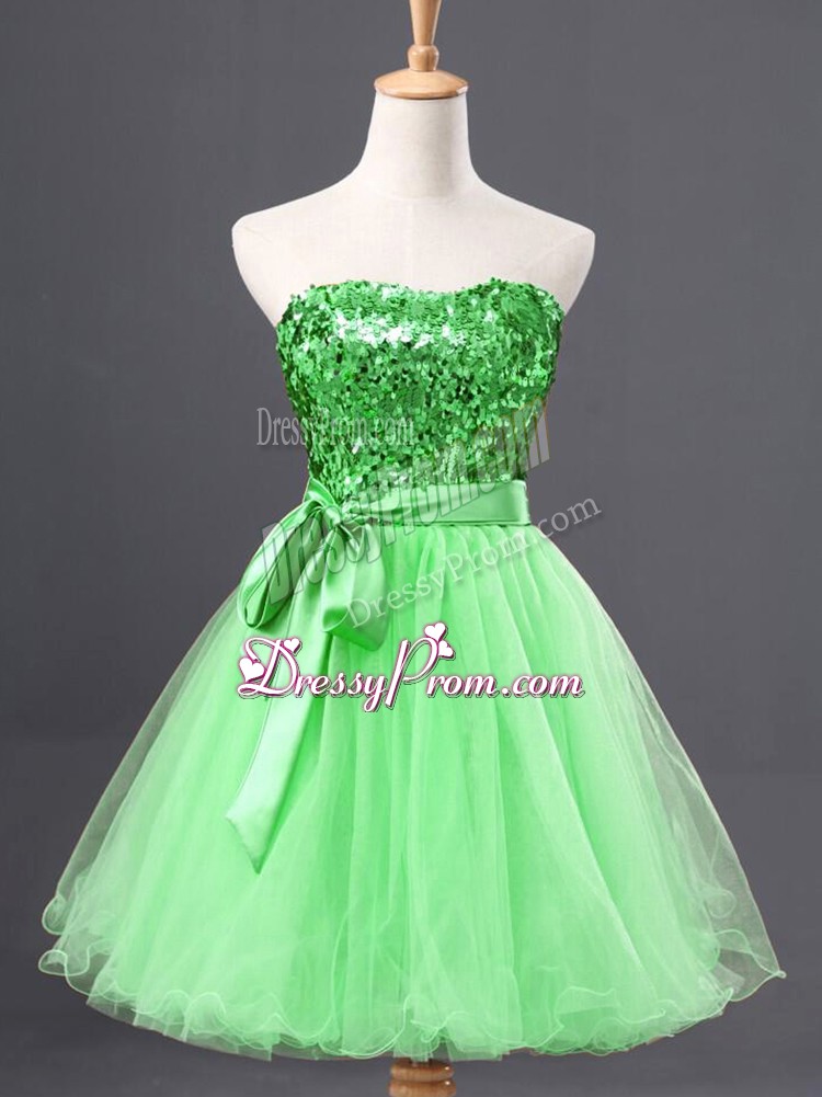 Neckline : SweetheartShown Color : Spring GreenSilhouette : A-lineSleeve Length : sleevelessHemline : mini lengthBack Detail : ZipperFabric : TulleEmbellishment : SequinsOccasion : Prom,PartySeason : Spring,Summer,Fall