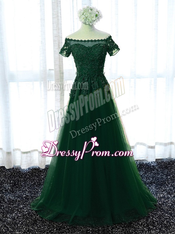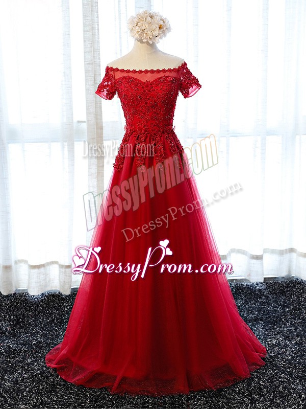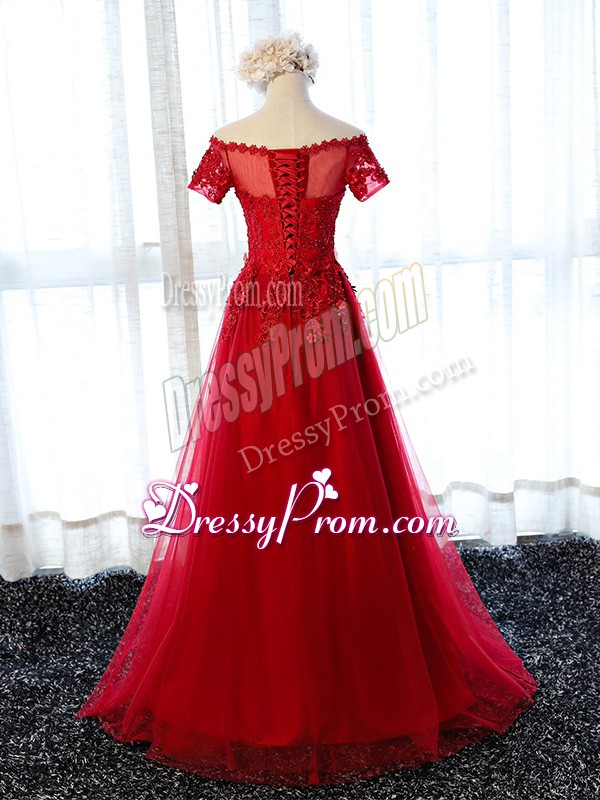 Neckline : Off the shoulder Shown Color : Red Silhouette : A-line Sleeve Length : short sleeves Hemline : floor length Back Detail : Lace up Fabric : Tulle Embellishment : Lace,Appliques Occasion : Prom,Party Season : Spring,Summer,Fall,Winter