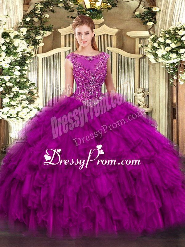 Neckline : ScoopShown Color : FuchsiaSilhouette : Ball GownsSleeve Length : sleevelessHemline : floor lengthBack Detail : ZipperFabric : OrganzaEmbellishment : Beading,RufflesOccasion : Military Ball,Sweet 16,QuinceaneraSeason : Spring,Summer,Fall,Winter