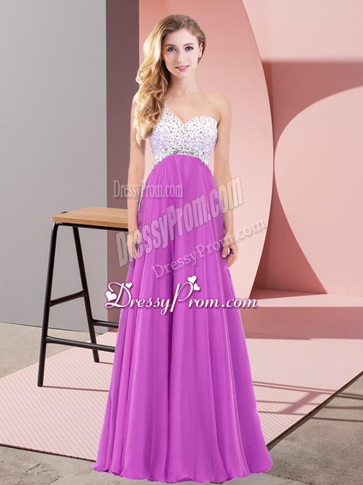 Neckline : One shoulderShown Color : FuchsiaSilhouette : EmpireSleeve Length : sleevelessHemline : floor lengthBack Detail : Lace upFabric : ChiffonEmbellishment : BeadingOccasion : Prom,PartySeason : Spring,Summer,Fall,Winter