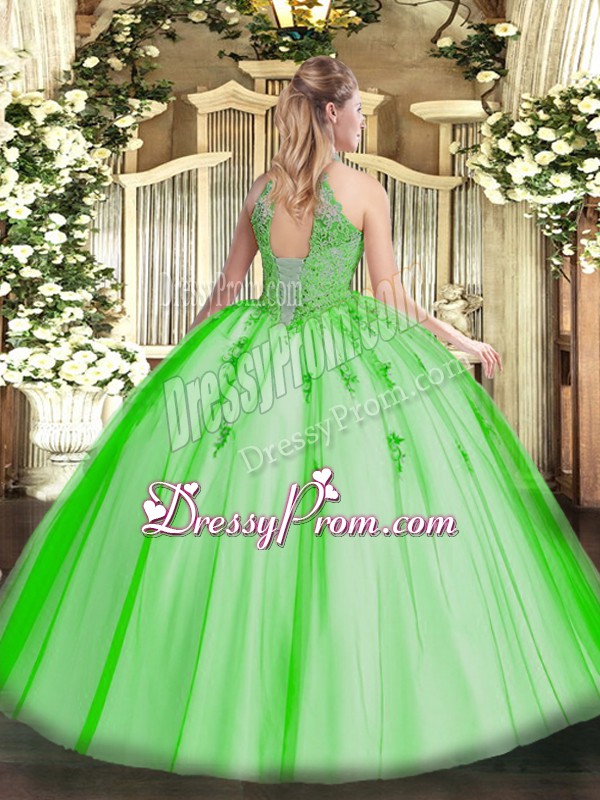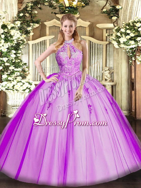 Neckline : Halter topShown Color : FuchsiaSilhouette : Ball GownsSleeve Length : sleevelessHemline : floor lengthBack Detail : Lace upFabric : TulleEmbellishment : Lace,AppliquesOccasion : Military Ball,Sweet 16,QuinceaneraSeason : Spring,Summer,Fall,Winter